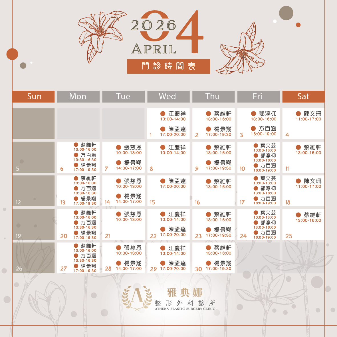 📣【2026年4月門診時間表】