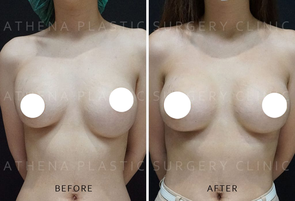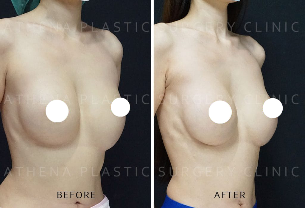 Remove the asymmetrical old prosthetic breast + replace with Bolimemo drops
