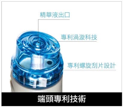 專利渦漩注入技術 端頭的螺旋刮片設計搭配負壓技術,使精華液注入過程中產生渦漩效果,讓髒汙在脫落的同時,給予肌膚滋潤與抗氧化防護。