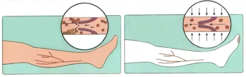 利用充氣套從腳踝→小腿→大腿漸進式壓縮,促進血液往心臟方向回流之流速。